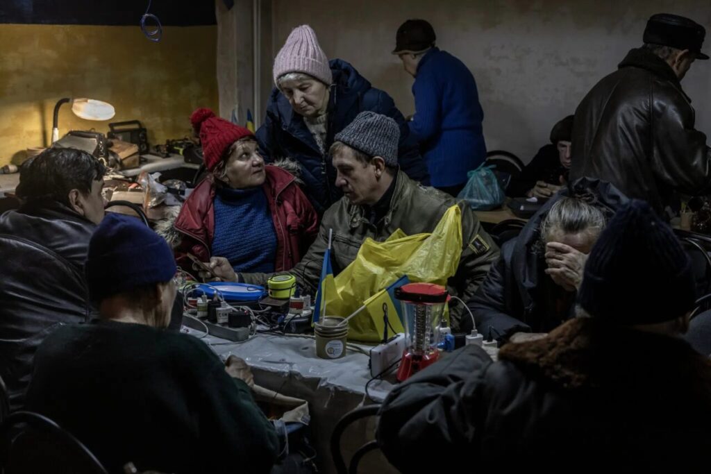 Residents gathering this month at a “point of invincibility,” where they can charge their phones, use the internet and receive humanitarian aid in the front line town of Chasiv Yar, in Ukraine’s eastern Donetsk region.