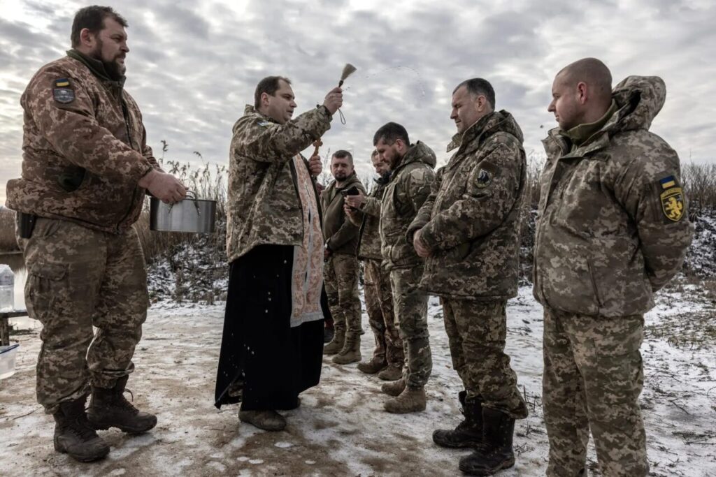 A Ukrainian military chaplain conducting a service as members of the 68th Brigade mark the Orthodox Christian feast of Epiphany on Jan. 6 in Ukraine’s northeastern Kharkiv region.
