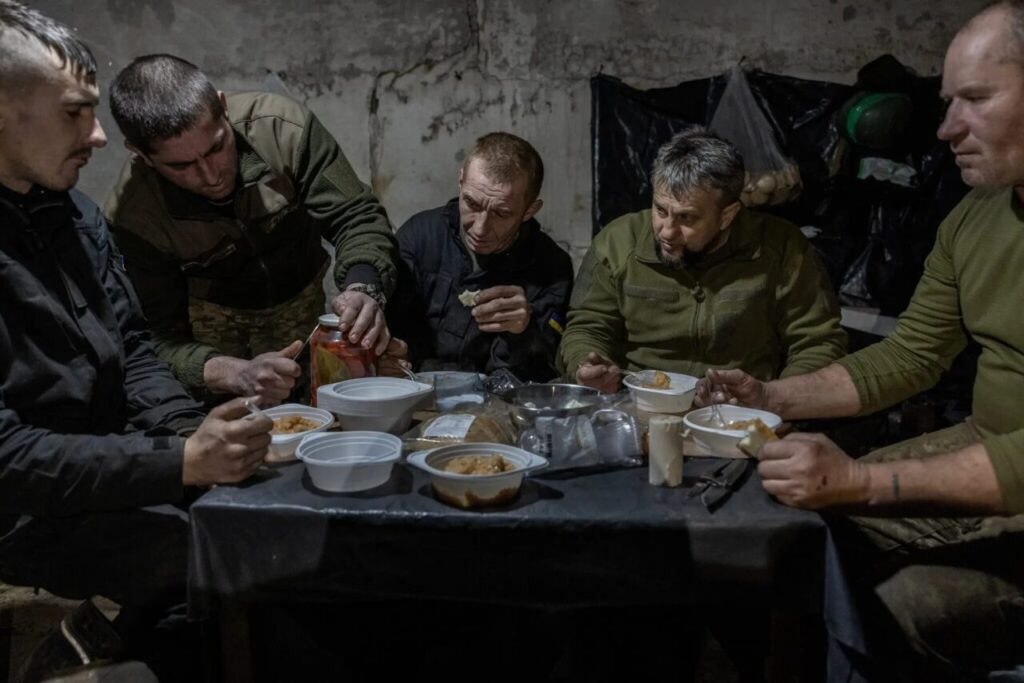 Members of a Ukrainian tank crew from the 42nd Brigade ate lunch in a bunker on the front line in Ukraine’s eastern Donetsk region. Because of their limited ammunition, the tank crew couldn’t remember the last time they’d been able to respond to a call.