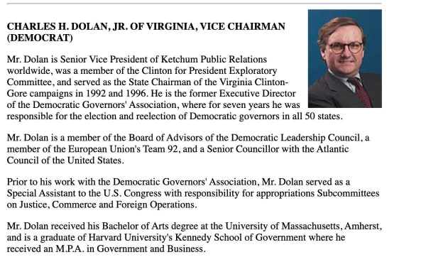 The public relations executive revealed by Durham to be a key (yet perhaps unwitting) Steele dossier player is Charles Dolan, a longtime Democrat tied to the Clintons since the early 1990s. After two consecutive stints as the Virginia state chair for Bill Clinton’s presidential campaign, Clinton appointed Dolan to an influential State Department board in 1997. Dolan also served Hillary Clinton’s two presidential campaigns, as advisor in 2008 and as a volunteer in 2016. (Durham did not name Dolan, but included biographical details that made him easy to identify).