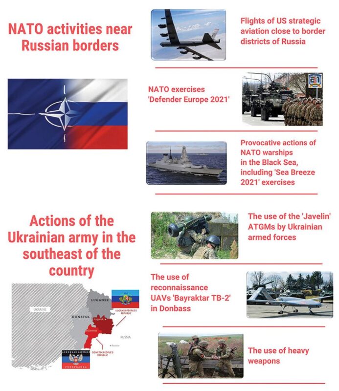 Instead of reigning in their Ukrainian protégés, NATO countries are pushing Kiev towards aggressive steps. There can be no alternative interpretation of the increasing number of unplanned exercises by the United States and its allies in the Black Sea. NATO members’ aircraft, including strategic bombers, regularly make provocative flights and dangerous manoeuvres in close proximity to Russia’s borders. The militarisation of Ukraine’s territory and pumping it with weapons are ongoing.