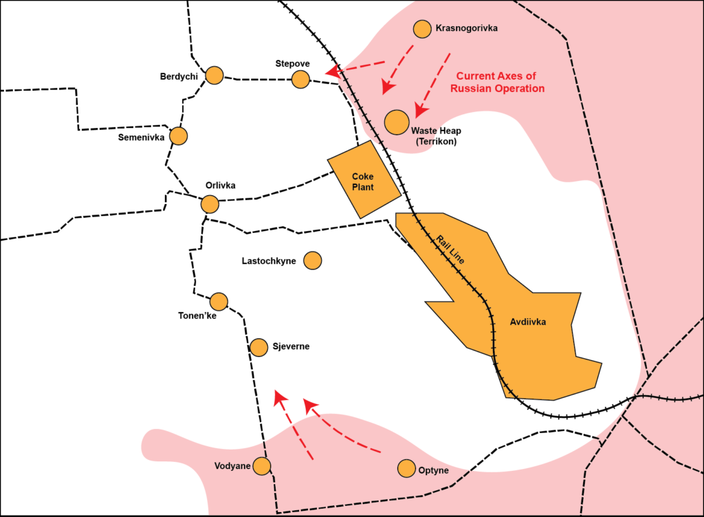 Avdiivka was already in something of a salient, owing to previous Russian operations which had captured the town of Krasnogorivka, to the north of the city. Over the month of October, Russian forces launched a large assault out of these positions and successfully captured one of the key terrain features in the area – a tall mound of discarded mining byproduct (a spoil heap) which directly overlooks the main railway into Avdiivka, and lies adjacent to the Avdiivka coke plant. As of this writing, the situation looks like so:
