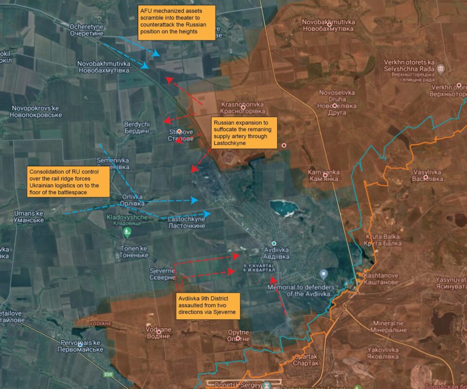 We need to think about that initial Russian assault in the context of the Avdiivka battlespace. Avdiivka is rather unique in that the entire city and the railway running towards it sit upon an elevated ridge. With the city now enveloped on three sides, remaining Ukrainian logistical lines run along the floor of a wetland basin to the west of the city – the only corridor that remains open. Russia now has a position on the dominating heights that directly overlook the basin, and are in the process of expanding their position along the ridge. In fact, contrary to the claim that the Russian assault collapsed with heavy casualties, the Russians continue to expand their zone of control to the west of the railway, have already breached the outskirts of Stepove, and are pushing into the fortified trench network in southeastern Avdiivka proper.