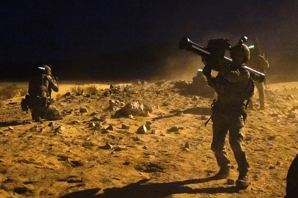 A Royal Marine, on right, carrying the Starstreak MANPAD Anti Air Missile during training at the U.S. Marine training center in Twentynine Palms, California, 2021. (Ministry of Defence/Flickr/Wikimedia Commons/OGL v1.0)
