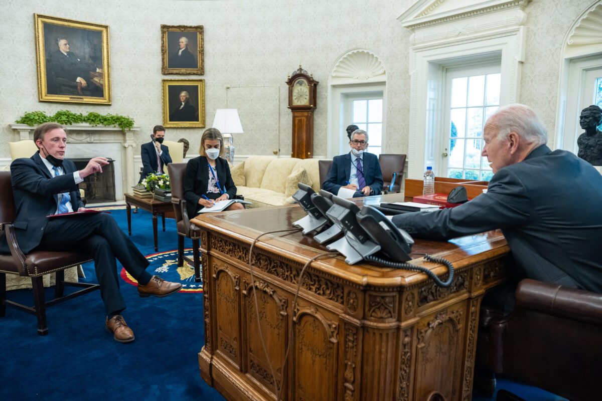 President Joe Biden confers with National Security Adviser Jake Sullivan during a phone call with Ukrainian President Volodymyr Zelenskyy, Thursday, August 25, 2022, in the Oval Office. (Official White House Photo by Adam Schultz)