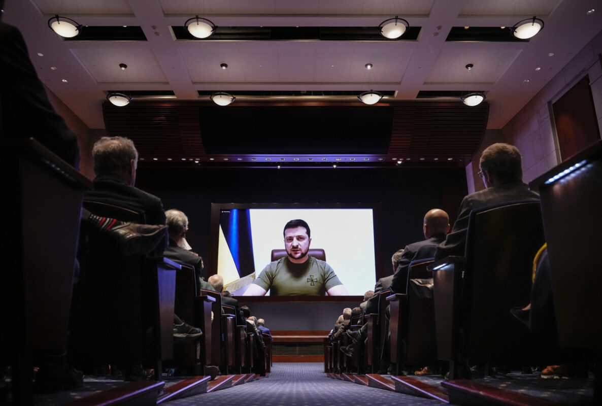 Ukrainian President Volodymyr Zelenskyy delivers a virtual address to Congress on March 16, 2022. | Drew Angerer/Getty Images