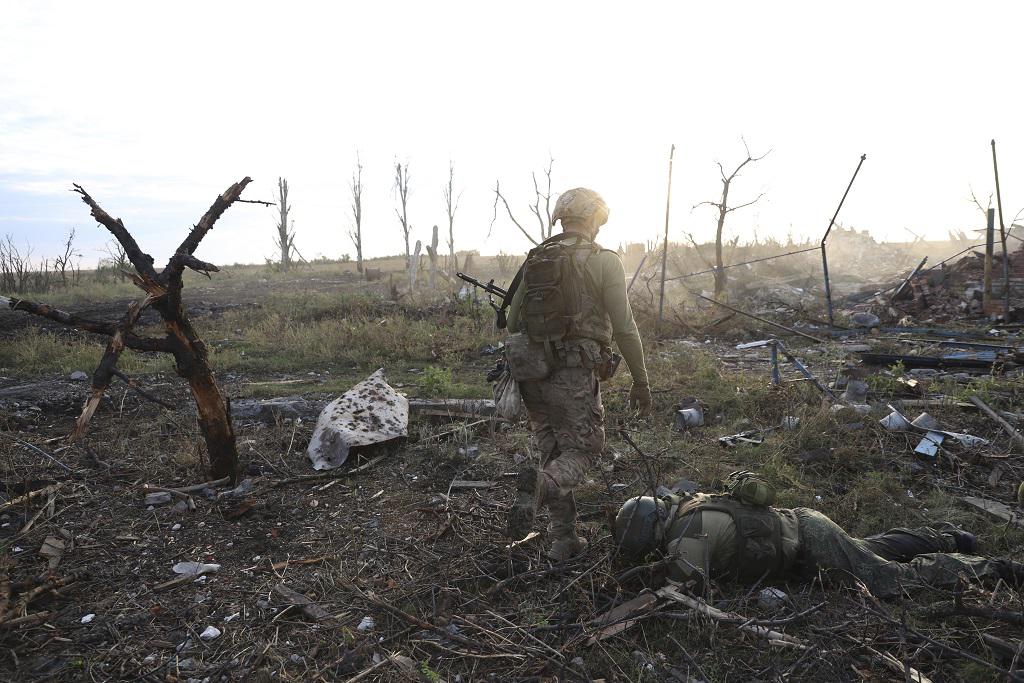 An assault unit commander from Ukraine’s 3rd Assault Brigade passes by the body of a dead Russian soldier at the front line in Andriivka, Donetsk region, Ukraine, September 16, 2023. ALEX BABENKO/AP PHOTO