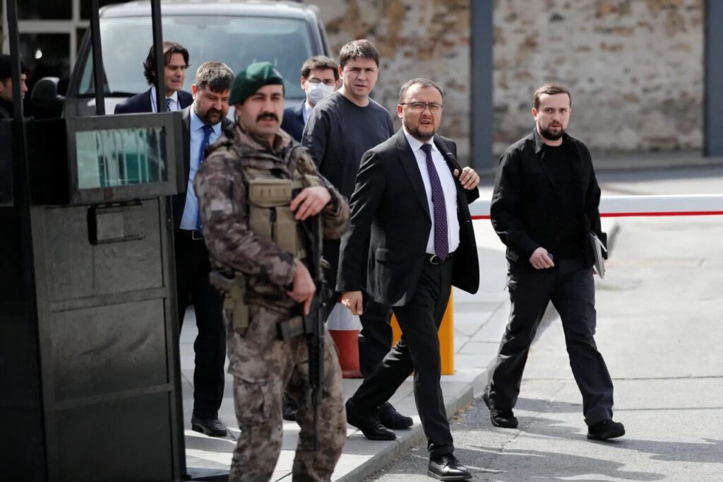 Podolyak and Ukrainian Ambassador to Turkey Vasyl Bodnar after a meeting with the Russians, Istanbul, March 2022 (Kemal Aslan / Reuters)