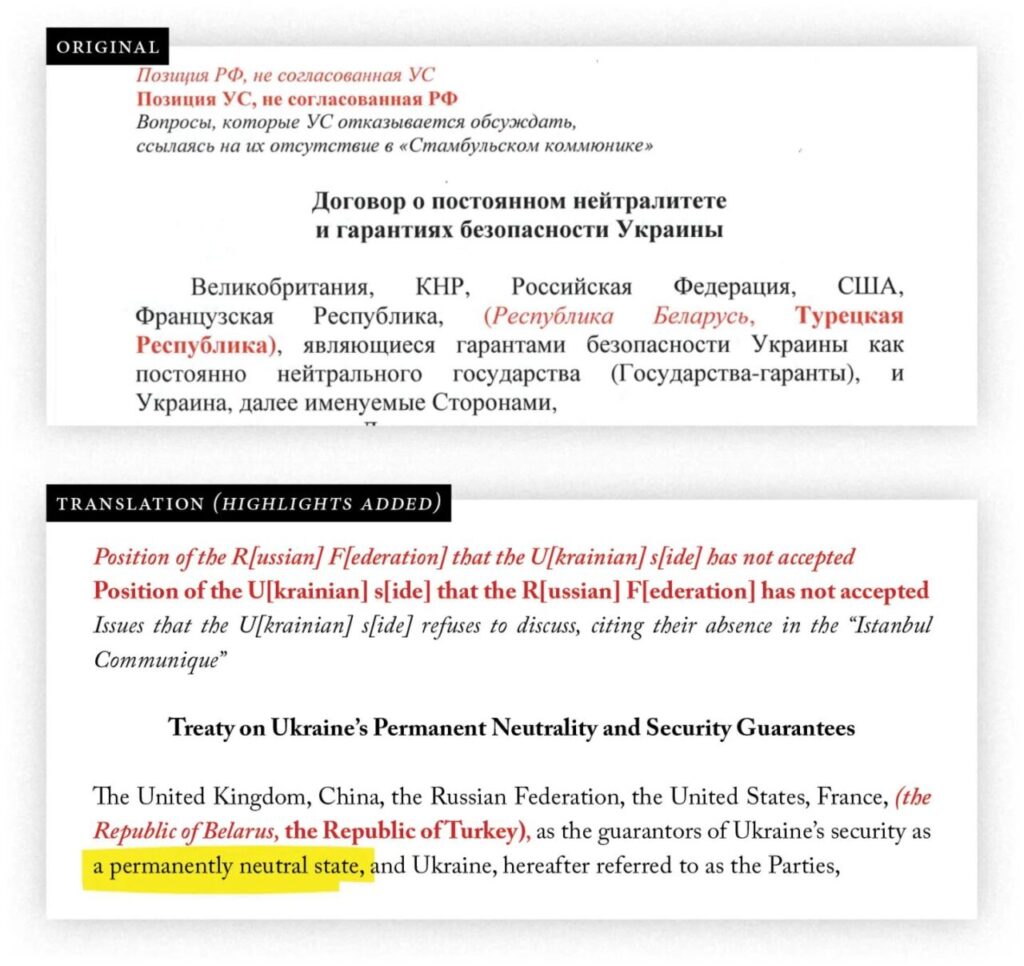 Excerpt of a draft Russian-Ukrainian treaty dated April 15, 2022. Red text in italics represents Russian positions not accepted by the Ukrainian side; red text in bold represents Ukrainian positions not accepted by the Russian side.