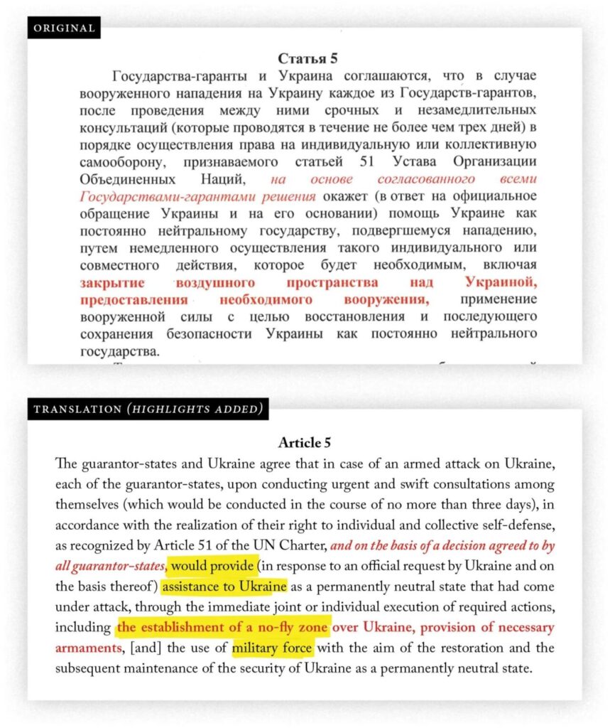 First, whereas the communiqué and the April 12 draft made clear that guarantor states would decide independently whether to come to Kyiv’s aid in the event of an attack on Ukraine, in the April 15 draft, the Russians attempted to subvert this crucial article by insisting that such action would occur only “on the basis of a decision agreed to by all guarantor states”—giving the likely invader, Russia, a veto. According to a notation on the text, the Ukrainians rejected that amendment, insisting on the original formula, under which all the guarantors had an individual obligation to act and would not have to reach consensus before doing so.