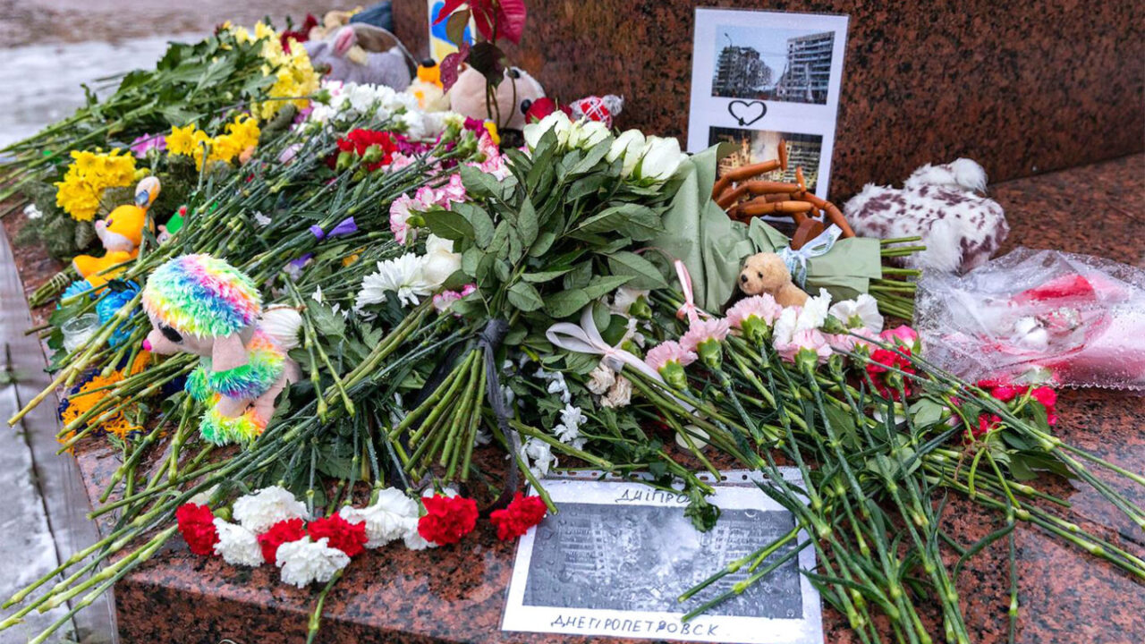Flowers left at a monument to Taras Shevchenko in St. Petersburg following the Dnipro missile attack. Alexei Smyshlyaev / Kommersant