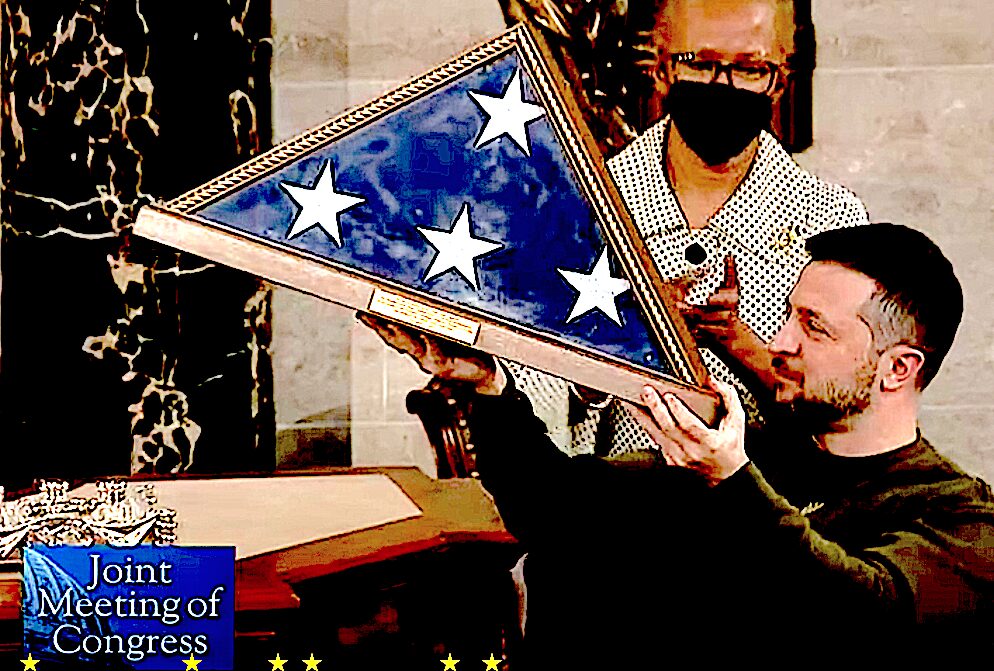 Ukraine’s President Volodymyr Zelensky displaying a present given by then House Speaker Nancy Pelosi after his speech to U.S. Congress on Dec. 21, 2022. (C-Span still)