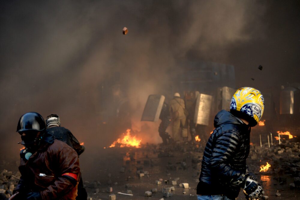 Feb. 18, 2014: Protesters throwing pieces of brick pavement at Ukrainian troops obscured by the smoke of burning tires in Kiev. (Mstyslav Chernov, CC BY-SA 3.0, Wikimedia Commons)