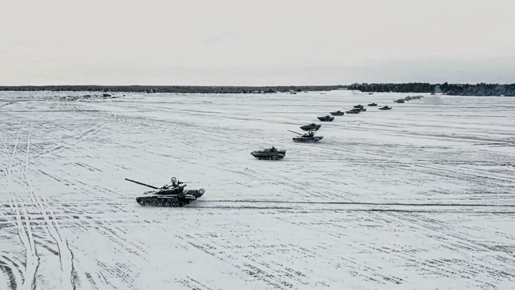 In this photo released on Feb. 4, 2022, tanks and armored vehicles move during Belarusian and Russian joint military drills at Brestsky firing range in Belarus. (Russian Defense Ministry Press Service via AP, File)