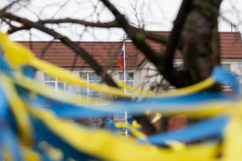 This photo shows blue and yellow ribbons, representing the Ukrainian flag, in front of the consulate general of Russia on April 15, 2022 in Klaipeda, Lithuania. Russia’s Kaliningrad exclave, on the shore of the Baltic Sea, is sandwiched between NATO members Lithuania and Poland and is the Baltic coasts most strategic transport and trade port.