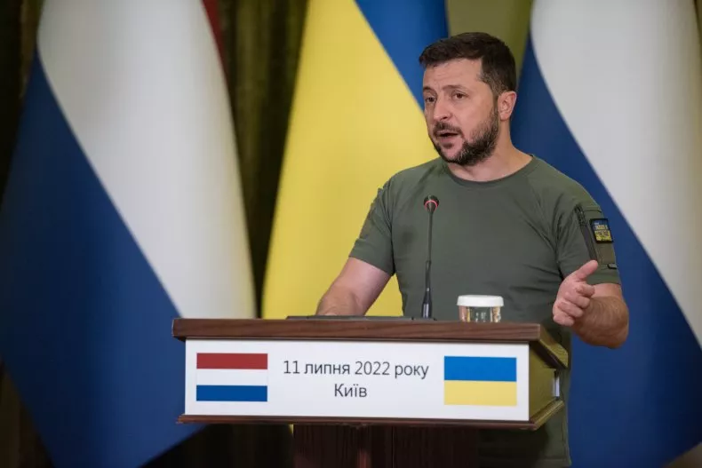 Ukrainian President Volodymyr Zelensky is seen during the press conference with Dutch Prime Minister, Mark Rutte on July 11, 2022 in Kyiv, Ukraine. Zelensky has repeatedly urged Western partners not to ease up on Russia sanctions.