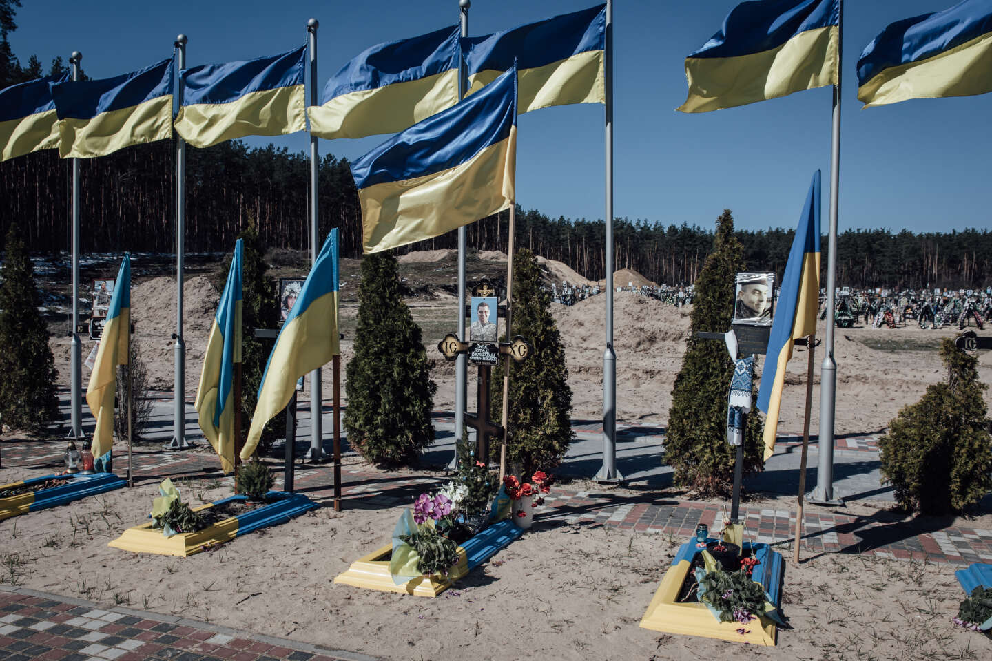 Dans le cimétière d'Irpin, les soldats mort au combat et habitants la ville sont enterrés dans l'allée des Héros. Irpin, le 30 mars 2023.
