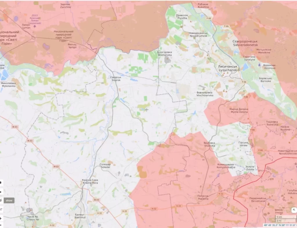 Russian forces south of Lysychansk have closed the corridor (“salient within the [Donbas] salient”) from Myrna Dolyna south through Hirske to Zolote [see map 1 and comparison map 2 of 48 hours earlier] and, according to the Russian Ministry of Defense, have trapped some 2000 Ukrainian troops (four battalions and an artillery unit) and foreign fighters. The closure of the salient but not the number of troops encircled has been confirmed by the UGS.