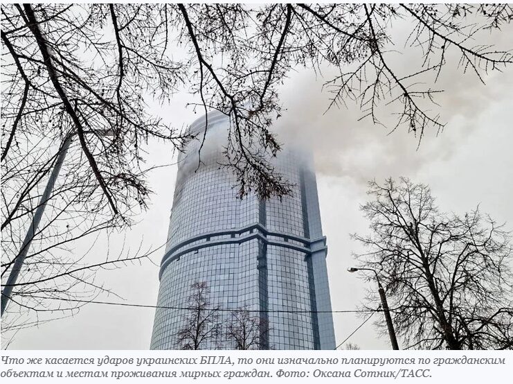 Grishin continues: This is clearly the revenge of enraged and envious enemies. In their typical 2-dimensional thinking they dream of inflicting any harm they can. The more outrageous, the better. Of all the incoming drones, only one was directed against an industrial enterprise. The others went straight for residential complexes, including those high-rise condos where the well-to-do live, as well as ordinary flats where ordinary people live, who survive on their salaries.