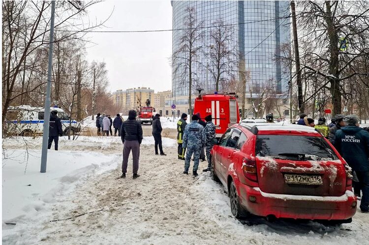 Residents of Kazan watch as emergency crews respond to the damage.