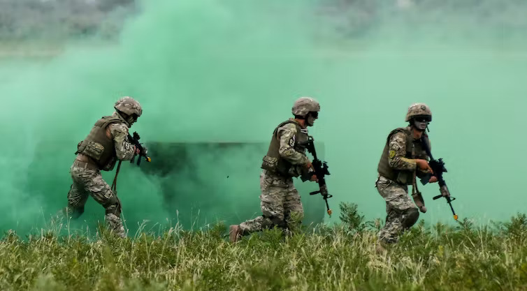 Georgian troops joined large-scale joint military exercises with NATO forces outside Tbilisi, Georgia, on Aug. 1, 2018, on the 10th anniversary of its war with Russia, which strongly opposes Tbilisi’s NATO membership bid. Vano Shlamov/AFP via Getty Images