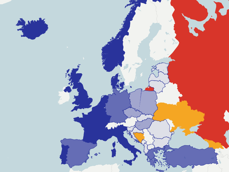 The U.S. and Canada are not on this map, but are also founding members of NATO.