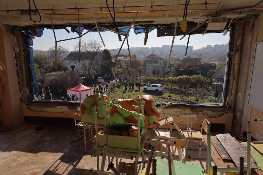 People gather outside a school damaged by a Russian strike in Odessa on Friday. (Oleksandr Gimanov/AFP/Getty Images)