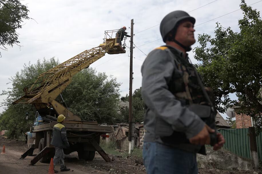 Electricians restore a power grid damaged by artillery fire and airstrikes in a village in the Donetsk region on July 23. (Anatolii Stepanov/AFP/Getty Images)