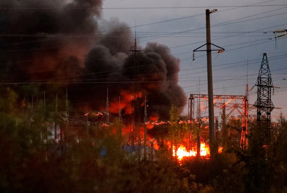 A transformer of an electrical substation burns after shelling from Ukraine in the town of Shebekino in the Belgorod region of Russia in late 2022. (Taisia Liskovets/Sputnik/AP)