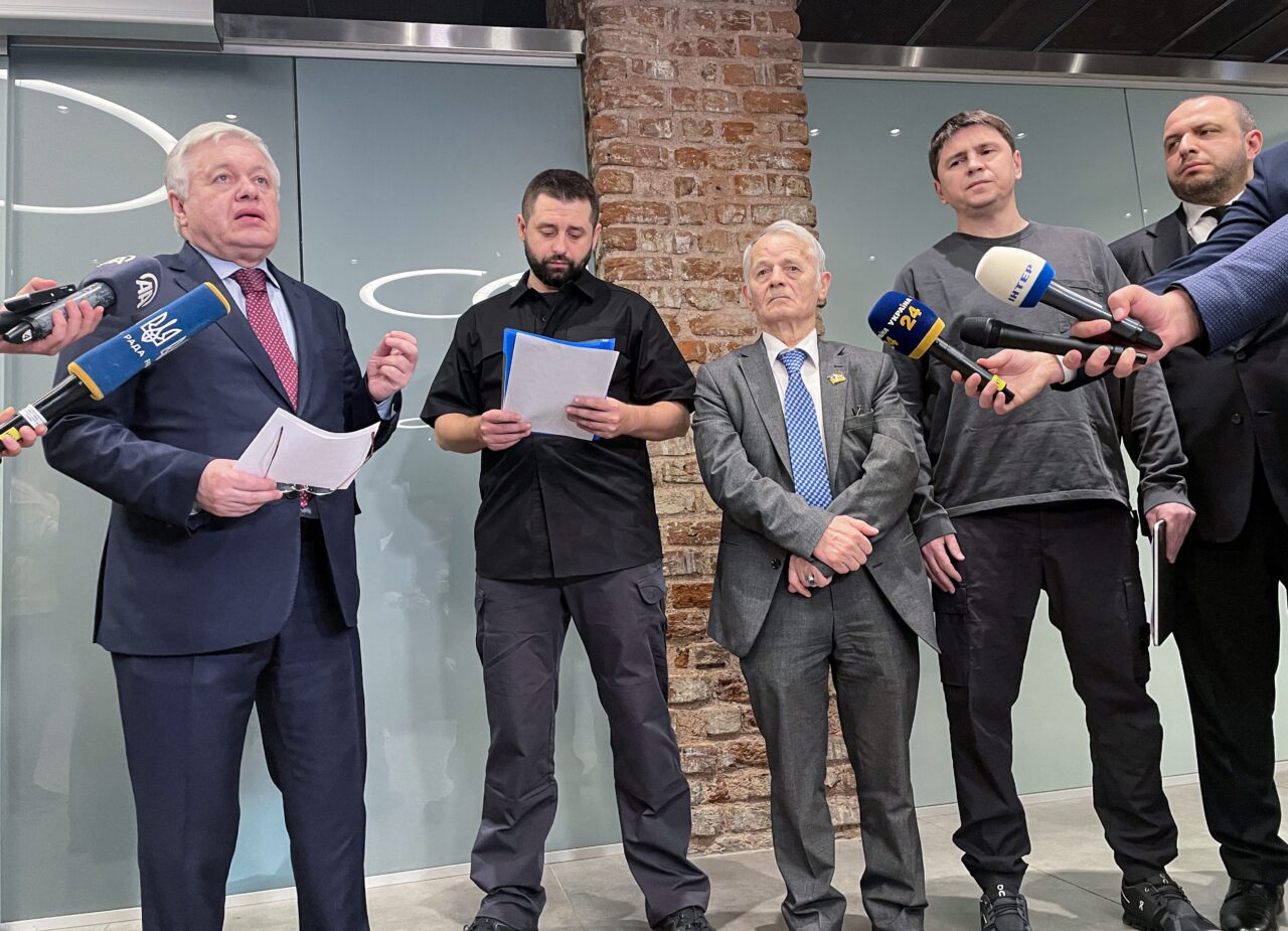 People's Servant Party leader Davyd Arakhamia (2nd from left) at the peace talks between delegations from Russia and Ukraine in Turkey, March 29, 2022. (Photo by Lokman Akkaya/Anadolu Agency via Getty Images)