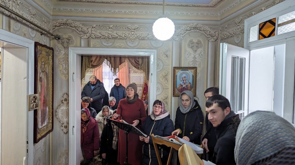 In Zadubrivka, also near Chernivtsi, I joined the local parish for a Sunday service in a small private house. Parishioners had been holding services there since their church was expropriated. The space consisted of two small rooms, so small that the church’s choir huddled by the entry door, squeezing whenever someone entered or exited the building. The interior doors had been removed from their frames to make more space. Ramon, an assistant to the church secretary, told me that the lack of space is an issue on big holidays. About 300 families out of the village’s 800 to 900 families attended the UOC church.