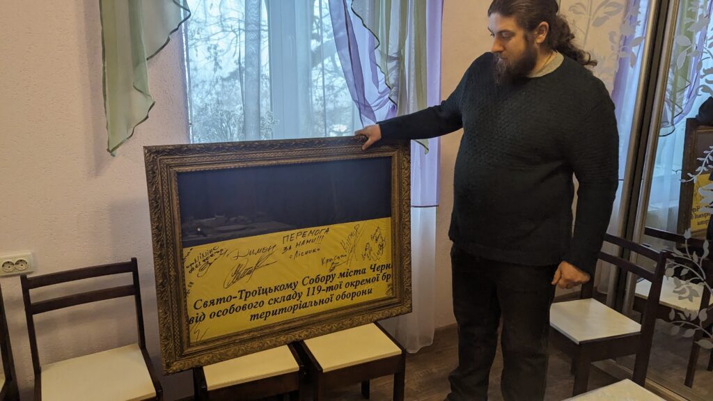 “We are patriots, we have helped our army from the beginning [of the war],” Archpriest Volodymyr told me. “We even received certificates attesting to the help we provided to the army.” He showed me a flag the members of the 33rd Special Mechanized Brigade of the Armed Forces of Ukraine signed in gratitude for the support his parish provided. I asked what kind of support. Technical assistance, food, bread, clothes, and all things needed, he said. They provide what they are asked to donate, what the soldiers on the frontline need at the moment. I asked whether his parishioners continued to do this despite the expropriation of their church. Yes, he said, noting that the 33rd Special Mechanized Brigade sent the signed flag a month ago. One member of his parish serves as a volunteer with the brigade, he added.