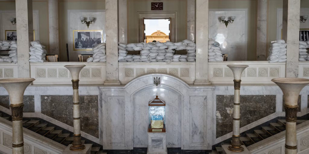 At first, all that can be seen from the Ukrainian Parliament, guarded by a checkpoint, are the neoclassical columns of the facade, redecorated in the Ukrainian colors of yellow and blue. Access to the chamber itself, an ultra-sensitive area of Kyiv, is even more restricted. Le Monde was granted exceptional access. After passing through a series of gates and staircases, you enter under high windows protected by sandbags, then along a marble railing, also fortified, in front of which two paintings of the Madonna and Child are displayed. Heavy engraved doors then open onto a room of ancient woodwork, bristling with Ukrainian and European flags, and topped by a spectacular glass dome. It was here, in the heart of the Rada, the Ukrainian Parliament, that MPs converged at the start of the invasion in February 2022, despite the risk of attack.