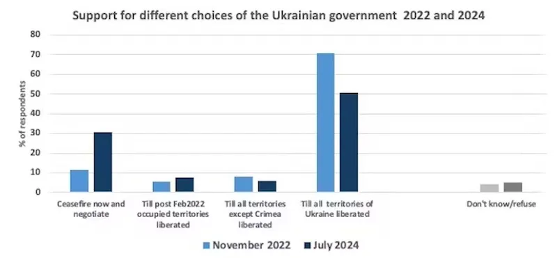 The biggest change was this: in 2022, 71% of respondents supported the proposition to “continue opposing Russian aggression until all Ukrainian territory, including Crimea, is liberated”, but in 2024, support for that option had dropped to 51%.