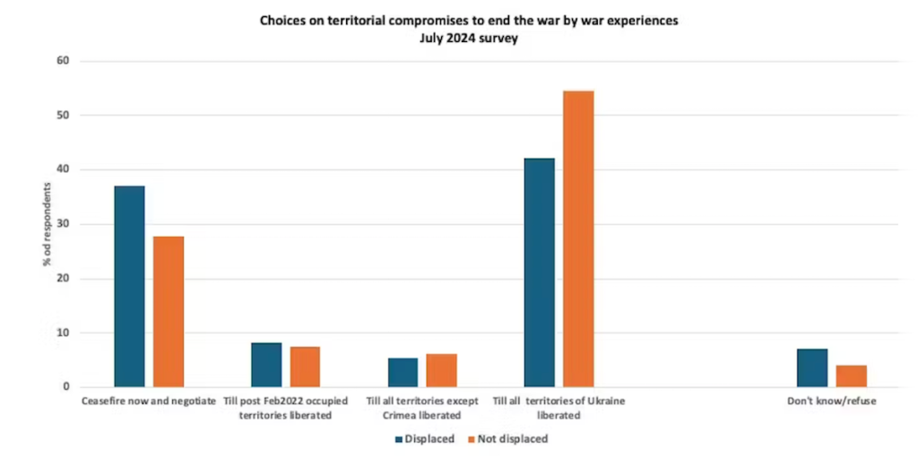 But when asked directly in the 2024 survey if they agreed with the statement “Russia should be allowed to control the territory it has occupied since 2022,” 90% disagreed. So while there is still a majority—if diminished—support for fighting to restore full territorial integrity, there is growing support for negotiations.
