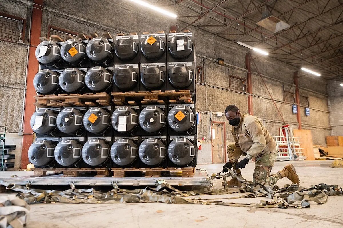Airman 1st Class Olabode Igandan, of the 436th Aerial Port Squadron passenger services, prepares ammunition, weapons and other equipment bound for Ukraine at Dover Air Force Base in Delaware on January 21, 2022. Photo: WikiCommons / US Air Force / Mauricio Campino