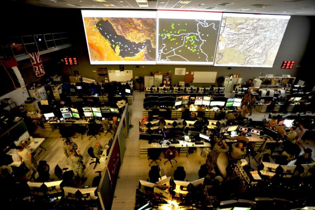 Combined Air Operations Center (CAOC) at Al Udeid Air Base, Qatar, intended to provide command and control of air power throughout Iraq, Syria, Afghanistan, and 17 other nations. (U.S. Air Force, Joshua Strang, Wikimedia Commons, Public domain)