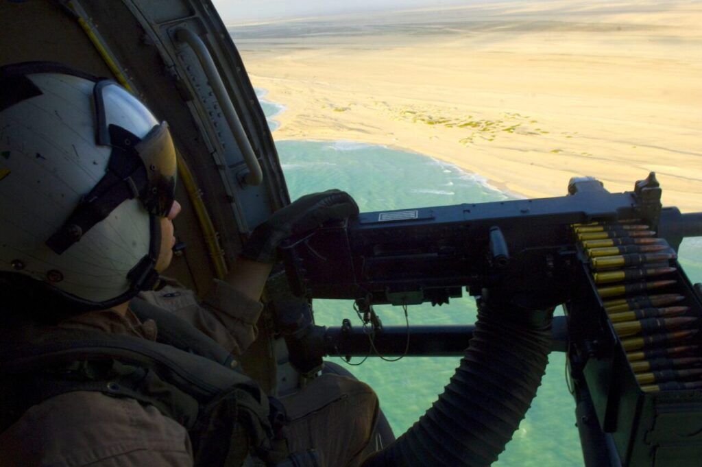 Sept. 21, 2009: U.S. air crewman in helicopter moving along the coast of Somalia. (U.S. Navy, Matthew Bash)