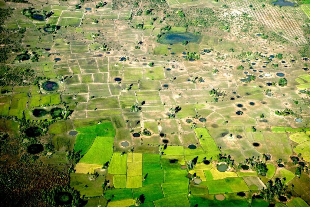 Bomb craters in 2014 left by U.S. bombing decades earlier in Kandal Province, Cambodia. (Kimlong Meng, Wikimedia Commons, CC BY-SA 4.0)