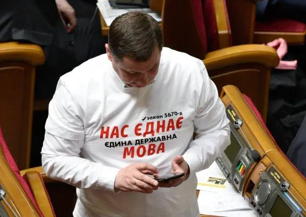 “A single state language unites us,” reads this t-shirt in Ukraine’s parliament, the Verkhovna Rada. [Source: opendemocracy.net]