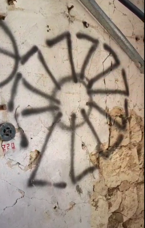 Black Sun Nazi symbol we found at building in village of Krymskoye that had been occupied by Ukrainian military. [Source: Photo courtesy of John Parker]