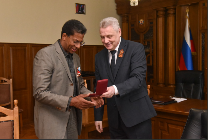 Chairman of the Lugansk People’s Republic, Sergey Kozlov presents John Parker with Honorary Badge for Good Deeds. [Source: Photo by Lugansk Information Center]