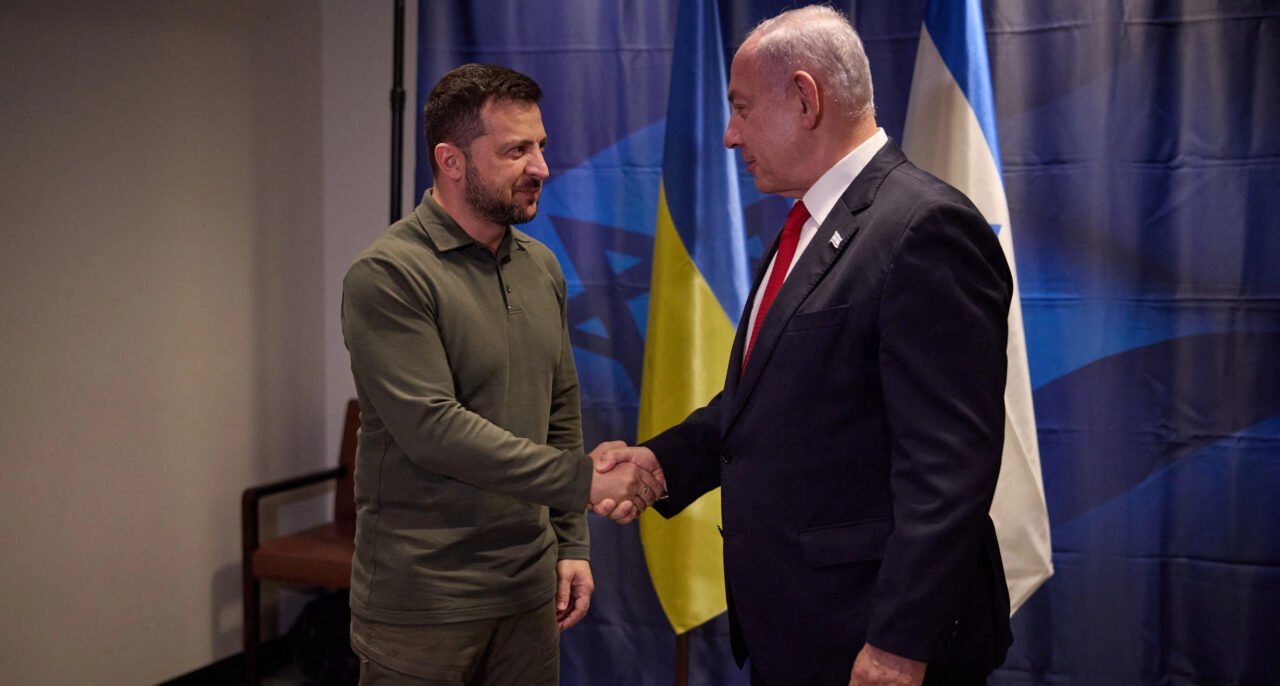 Handout photo shows President of Ukraine Volodymyr Zelensky shakes hands with Israeli PM Benjamin Netanyahu at the 78th session of the United Nations General Assembly (UNGA) at U.N. headquarters on September 19, 2023 in New York City, NY, USA. World heads of state and representatives of government will attend amidst multiple global crises such as Russia's illegal war against Ukraine, and the climate emergency. Photo by Ukrainian Presidency via ABACAPRESS.COM and Reuters