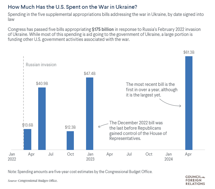 Since February 2022, Congress has approved more than $175 billion in aid to Ukraine. The most recent aid package approved by Congress in April provided $61 billion in additional aid and is estimated to last through January 2025. The bill faced many obstacles, chief among them former President Trump and his running mate JD Vance. In February, Trump pressured House Republicans to block a previous foreign aid package that included military assistance for both Ukraine and Israel. In April, when a new bill was introduced for Ukraine aid alone, JD Vance was a key member of the conservative opposition that stalled its passage. Trump ultimately gave tacit support to House Speaker Mike Johnson (R-LA) to bring the new aid bill to the House floor.
