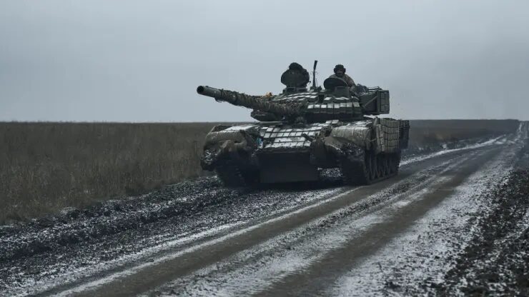 A Ukrainian tank drives along the field on December 7, 2023 in Avdiivka, Ukraine. Kostya Liberov | Getty Images