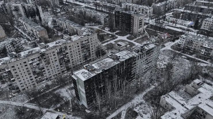 Panorama of the city from a bird’s-eye view, shot on a drone, covered with snow on December 7, 2023 in Avdiivka, Ukraine. Libkos | Getty Images