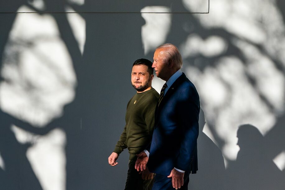 President Biden escorts Volodymyr Zelensky to the Oval Office during the Ukrainian president’s high-stakes visit to Washington late last year. (Demetrius Freeman/The Washington Post)